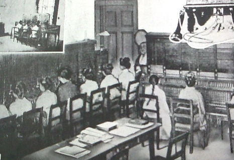 電話交換手は、洋の東西を問わず女性が勤めるものらしく、女学校を出たばかりのような若い女性達がキチンと並んでいます。